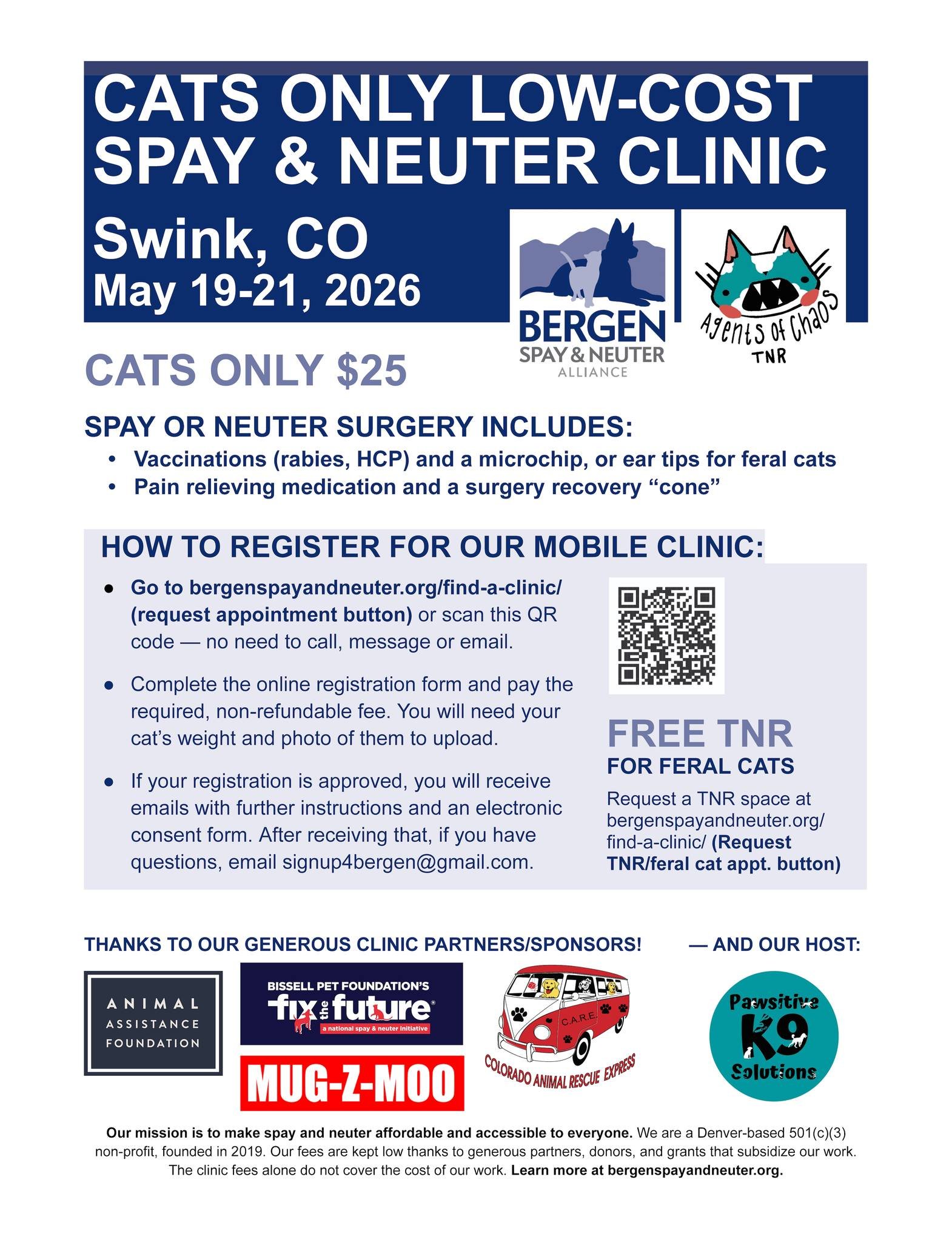 Scheduling Questions? Contact booking@bergenspayandneuter.org or TEXT 719-657-7115.